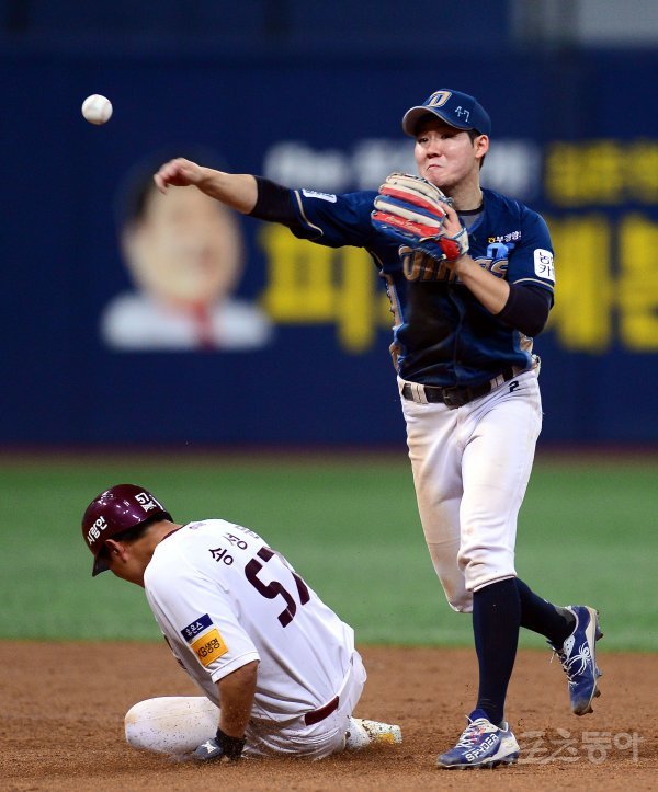 3회말 1사 1루 키움 박동원 내야 땅볼 때 NC 박민우가 1루주자를 포스 아웃 시킨 후 송구하고 있다.