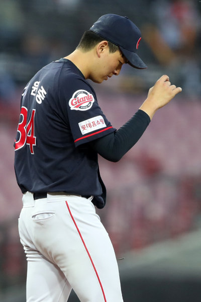 22일 오후 광주-기아챔피언스필드에서 열린 ‘2019 신한은행 MY CAR KBO리그’ KIA 타이거즈와 롯데 자이언츠의 경기에서 3회말 2사 주자 1,3루 상황에서 롯데 자이언츠 김원중이 폭투로 득점을 허용하자 고개를 떨구고 마운드로 가고 있다. 사진제공|스포츠코리아