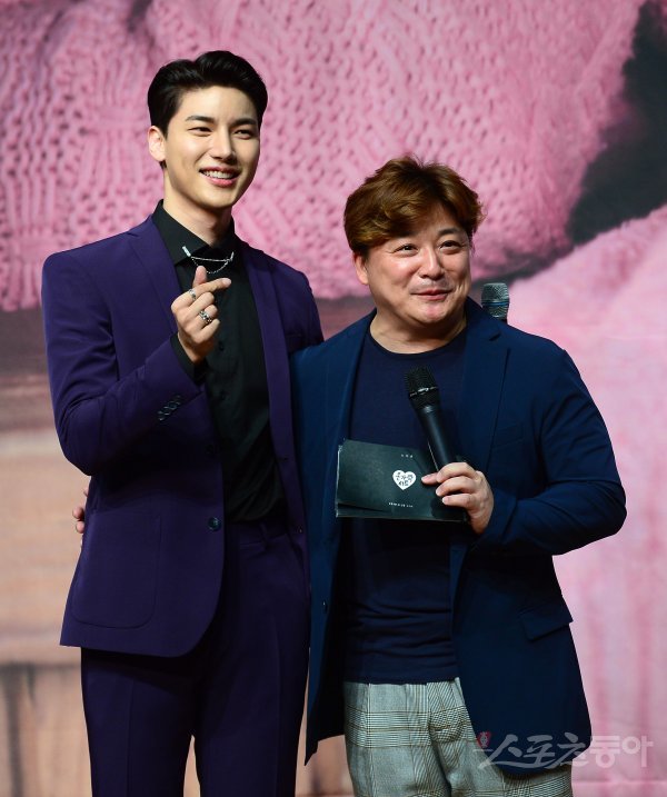 오디션 프로그램 ‘MBC 위대한 탄생 시즌1’에서 탄탄한 가창력으로 대중들의 눈길을 끌며 TOP8까지 돌랐던 가수 노지훈이 23일 서울 강남구 일지아트홀에서 가진 싱글 앨범 ‘손가락하트’ 발매 쇼케이스에서 개그맨 윤정수와 포토타임을 하고 있다.