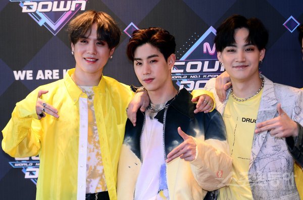 23일 서울 상암동 CJ E&M센터에서 열린 ‘엠카운트다운’ 리허설에 갓세븐(GOT7) 유겸, 마크, JB가 참석해 카메라를 향해 포즈를 취하고 있다.