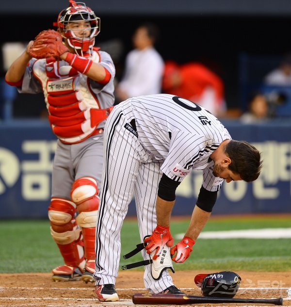 LG 조셉이 1회말 2사 1,2루에서 헛스윙 삼진을 당한 후 장비를 벗고 있다.