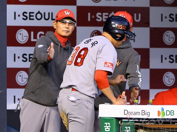 SK 염경엽 감독이 3회초 1사 3루에서 득점에 성공한 고종욱을 반기고 있다.