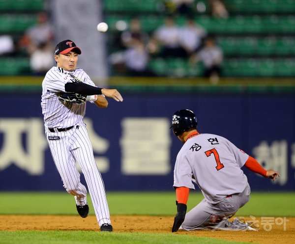 LG 2루수 신민재가 4회초 1사 1루에서 2루로 향하는 SK 정현을 포스 아웃 시킨 후 1루로 송구하고 있다.
