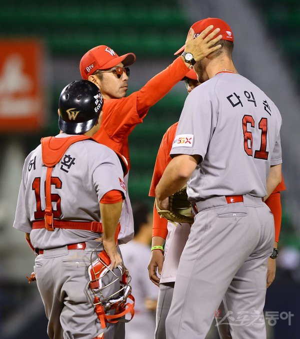 SK 손혁 코치가 5회말 1사 1루에 마운드에 올라가 선발 다익손의 머리를 쓰다듬고 있다.