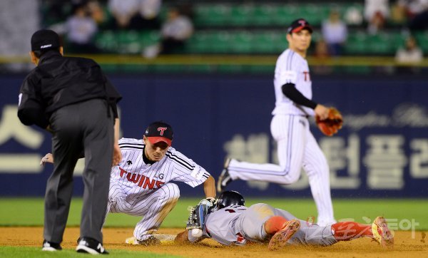 LG 2루수 신민재가 7회초 2사 1루에서 글러브에 공이 빠지며 SK 노수광에게 도루를 허용하고 있다.
