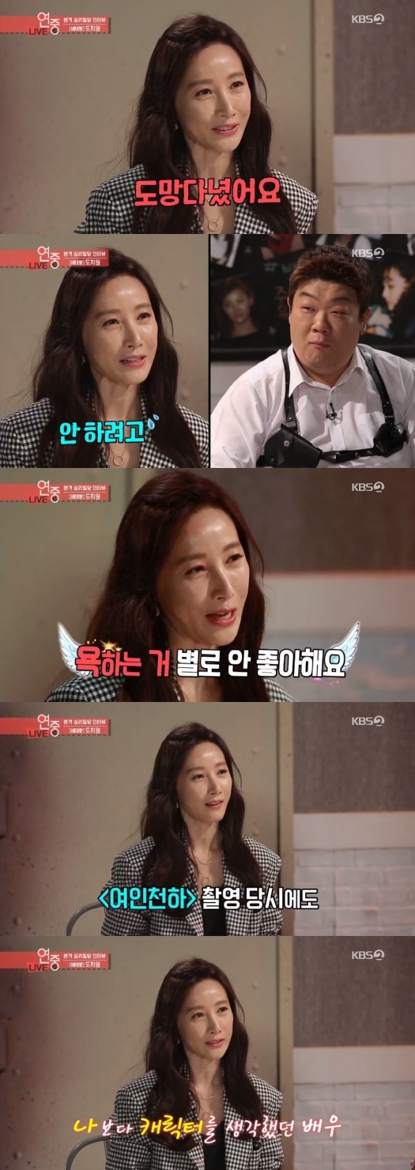 이날 도지원은 SBS 드라마 ‘여인천하’가 언급되자 “처음에는 이 역할을 안 하기 위해 도망쳤다. 사실 나는 욕하는 걸 별로 좋아하지 않는다”고 말했다.