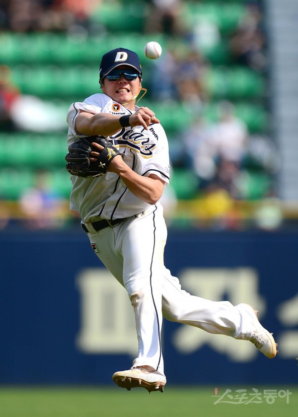 5회초 두산 류지혁이 땅볼 타구를 잡아 1루로 송구하고 있다.