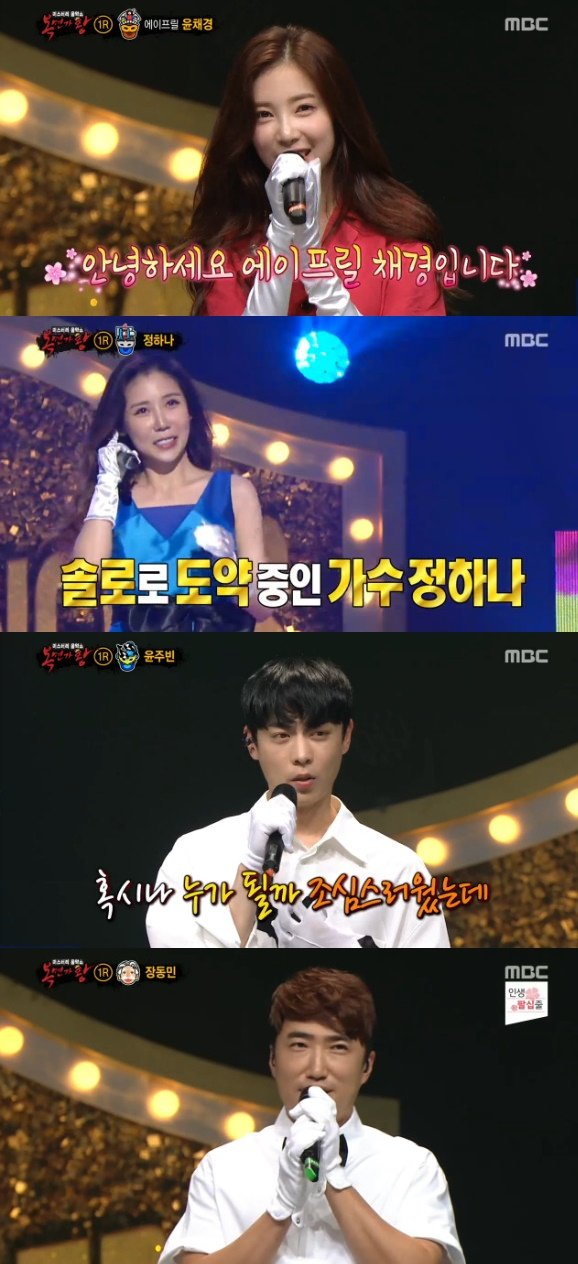 26일 MBC ‘복면가왕’에서는 103대 왕좌에 도전하는 새로운 복면 가수 8인의 듀엣 무대가 펼쳐졌다. 그룹 에이프릴 윤채경, 시크릿 출신 정하나는 무대에 대한 간절함으로 감동을 선사했고 배우 윤주빈은 윤봉길 의사의 종손으로서 출연에 의미를 뒀다. 그 중에서도 코미디언 장동민은 '복면가왕' 최저 득표 타이틀을 거머쥐었다.
