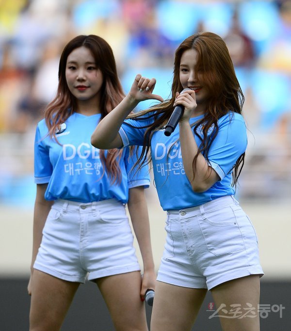 걸그룹 모모랜드의 낸시(오른쪽)가 전반전을 마친 후 하프타임 때 축하공연을 펼치고 있다.