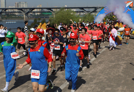 롯데 유통사업부문이 26일 서울 뚝섬 한강공원에서 ‘제3회 롯데 스타일런’ 마라톤 대회를 개최했다. 슈퍼마리오 등 자신만의 개성을 담은 복장과 분장을 하고 달리는 이색 마라톤 행사다. 5km와 10km 코스로 열렸으며, 5000여 명이 참가했다.