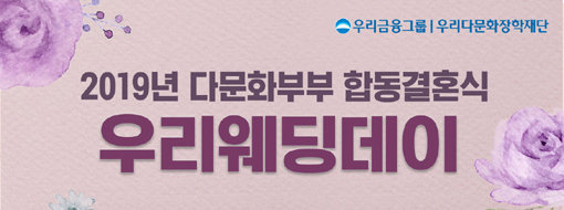 우리금융그룹 우리다문화장학재단이 7월 14일 우리은행 본점에서 진행하는 다문화부부 합동결혼식 ‘제8회 우리웨딩데이’ 참여 부부를 모집(사진)한다. 결혼식, 웨딩촬영, 신혼여행 비용을 재단에서 지원하며 6월 5일까지 우리다문화장학재단 홈페이지를 통해 신청하면 된다. 신청사연, 소득수준, 부양가족 수 등을 고려해 총 10쌍의 부부를 선정한다. 손태승 우리금융그룹 회장이 주례로 참여해 다문화 부부의 결혼을 축하할 예정이다.