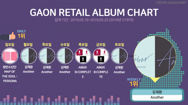 한편, 21주차 일간 소매점 앨범차트에서는 19일 방탄소년단 ‘MAP OF THE SOUL : PERSONA’, 20~22일 김재환 ‘Another’, 23~24일 AB6IX ‘B:COMPLETE’, 25일 김재환 ‘Another’가 1위에 랭크됐다.