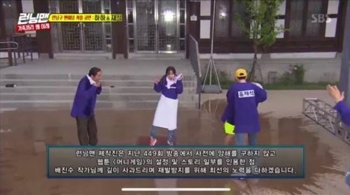 이날 ‘런닝맨’ 측은 본방송에 앞서 “‘런닝맨’ 제작진은 지난 449회 방송에서 사전에 양해를 구하지 않고 웹툰 ’머니게임’의 설정 및 스토리 일부를 인용한 점 배진수 작가님께 깊이 사과드리며 재발 방지를 위해 최선의 노력을 다하겠습니다”라는 사과 자막을 내보냈다.