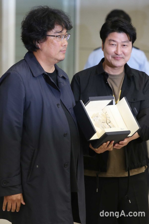 영화 '기생충'으로 프랑스 칸영화제에서 황금종려상을 수상한 봉준호 감독과 배우 송강호가 27일 인천공항을 통해 귀국하고 있다.