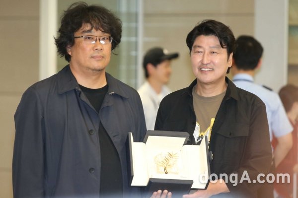 봉준호 감독과 송강호는 27일 오후 3시 15분께 인천국제공항 제2 터미널을 통해 금의환향했다. 두 사람은 칸 황금종려상 상패를 꺼내 들고 밝은 미소로 취재진, 팬들에게 인사를 했다.