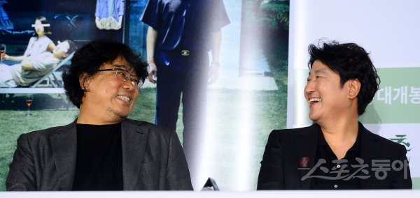 봉준호 감독과 배우 송강호(오른쪽)가 28일 서울 용산구 CGV 용산아이파크몰에서 열린 영화 ‘기생충’ 언론시사회에 참석해 서로 마주보며 환하게 웃고 있다.