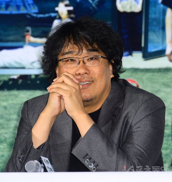 봉준호 감독이 28일 서울 용산구 CGV 용산아이파크몰에서 열린 영화 ‘기생충’ 언론시사회에 참석해 취재진의 질문을 들으며 미소를 짓고 있다.