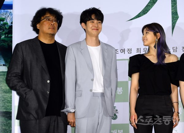 배우 최우식(가운데)이 28일 서울 용산구 CGV 용산아이파크몰에서 열린 영화 ‘기생충’ 언론시사회에 참석해 포토타임을 갖고 있다.