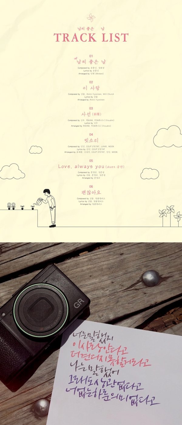 산들은 28일 자정 소속사 WM엔터테인트먼트의 공식 SNS계정을 통해 두 번째 솔로 미니 앨범 \'날씨 좋은 날\'의 트랙리스트와 캘리그라피로 된 가사 티저를 공개했다.