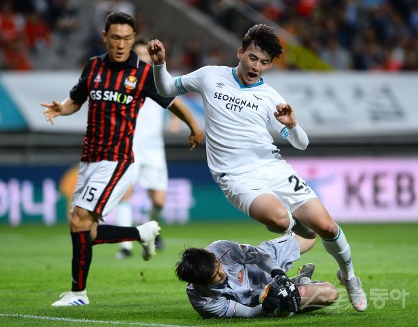 전반 성남FC 박관우가 FC서울 골문 앞에서 슈팅을 시도했으나 골키퍼 유상훈의 선방에 막히고 있다.