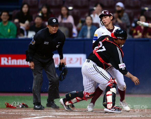 4회말 1사 3루 키움 박병호 외야플라이 아웃 때 3루주자 이정후가 태그업 시도해 홈으로 달렸으나 아웃되고 있다.
