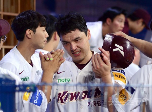 6회말 무사 1,3루 키움 희생타 때 득점한 3루주자 박동원이 더그아웃에서 하이파이브하고 있다.
