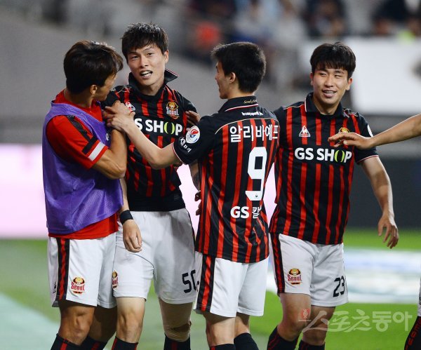 후반 FC서울 박동진이 선취골을 넣은 후 동료들의 축하를 받고 있다.