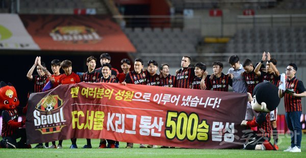경기 후 통산 500승을 달성한 FC서울 선수들이 기쁨을 나누고 있다.