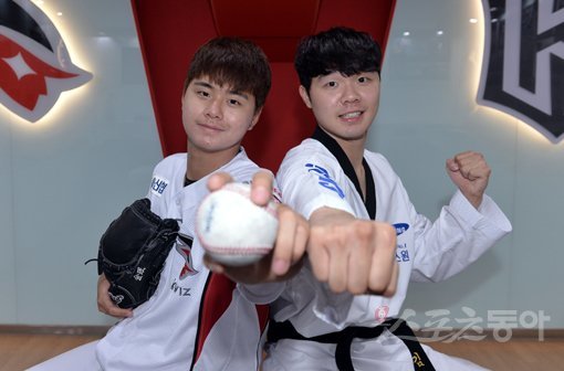 “브라더∼ 동반 메달 가자!” 태권도 김훈(오른쪽)과 프로야구 김민은 한국을 대표할 만한 스포츠 인재들이다. 형제는 각기 다른 종목에서 2020년 도쿄올림픽 동반 메달을 노리고 있다. 최근 수원KT위즈파크에서 태권도복과 야구 유니폼을 입고 포즈를 취한 김훈-김민 형제. 수원|김민성 기자 marineboy@donga.com
