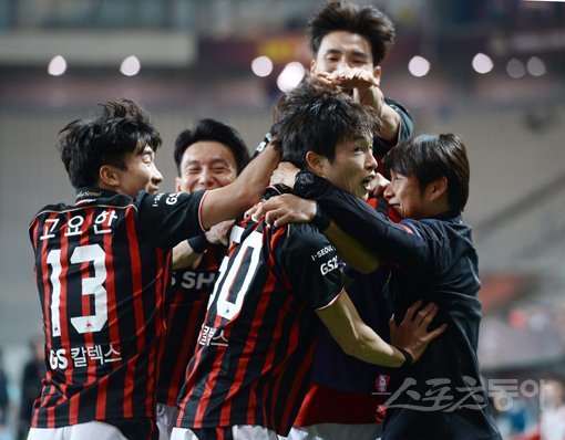 FC서울 박동진(가운데)이 28일 서울월드컵경기장에서 열린 ‘하나원큐 K리그1 2019’ 성남FC와의 맞대결에서 후반 3분 선제골을 넣은 뒤 동료들의 축하를 받고 있다. 상암|김진환 기자 kwangshin00@donga.com