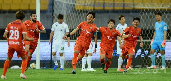 29일 춘천송암스포츠타운 주경기장에서 열린 프로축구 ‘하나원큐 K리그1 2019’ 전북현대와 강원FC 경기에서 강원 김오규가 역전골을 성공시킨 후 환호하고 있다.