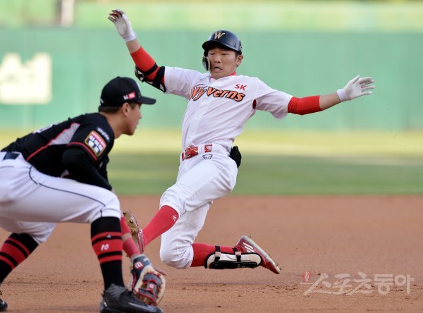 1회말 무사에서 SK 김재현이 3루타를 날린 뒤 슬라이딩 세이프되고 있다.