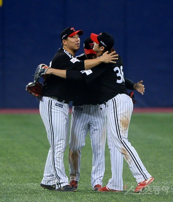 LG 김현수와 이천웅, 이형종(왼쪽부터)이 경기 후 포옹을 하고 있다.