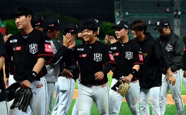 kt가 SK에 8-6 짜릿한 역전승을 거둔 뒤 선수들이 그라운드에서 코치들의 환영을 받고 있다.