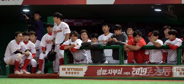 6-8로 뒤진 9회말 SK의 마지막 공격 때 선수들이 더그아웃에서 경기를 지켜보고 있다.