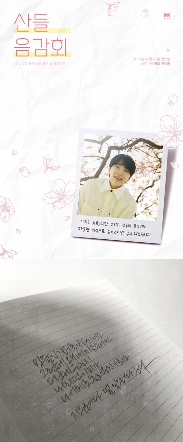 산들은 30일 자정 소속사 WM엔터테인트먼트의 공식 SNS계정을 통해 두 번째 솔로 미니 앨범 \'날씨 좋은 날\'의 음감회 포스터와 함께 캘리그라피로된 가사 티저를 오픈했다.