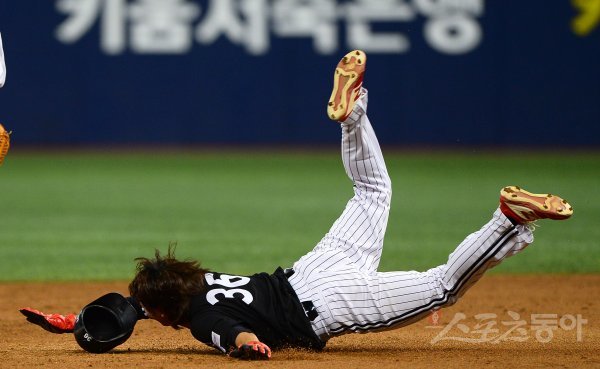 LG 이형종이 3회초 2사 1루에서 상대 투수 실책으로 2루로 쇄도하는 중 어설픈 슬라이딩을 하고 있다.