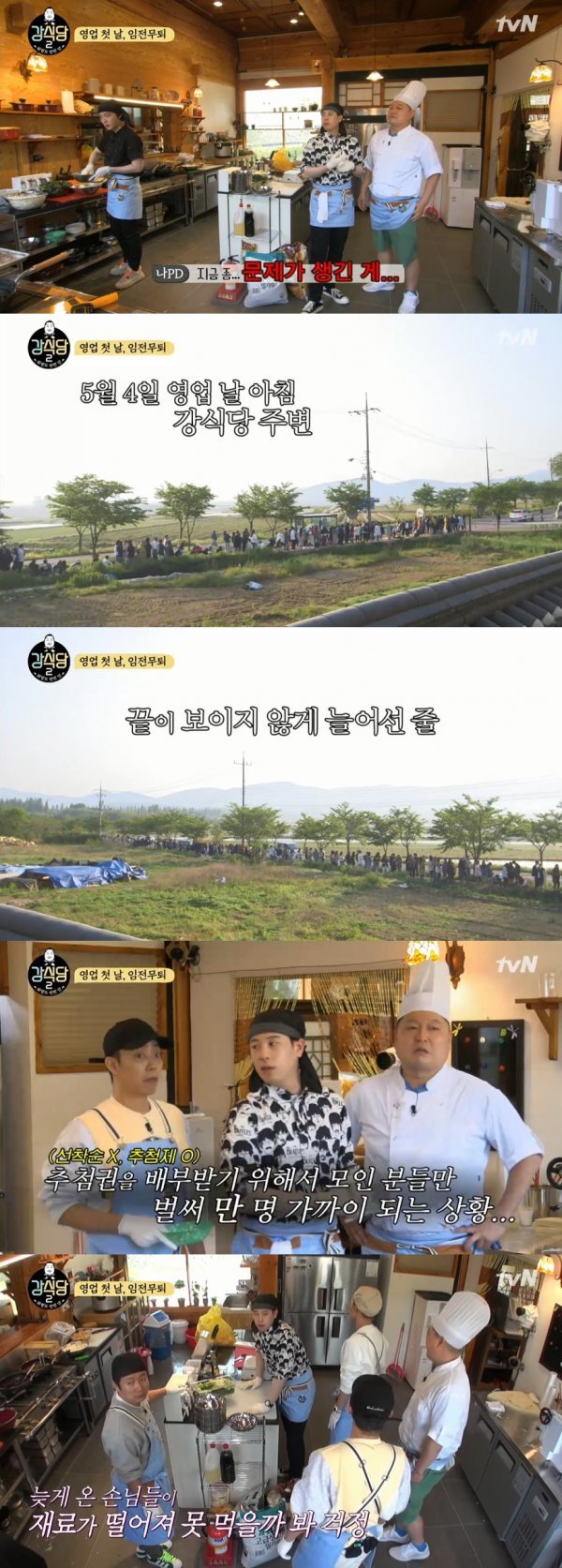 이날 나영석 PD는 “지금 좀 문제가 생겼다”며 총 만 명의 사람들이 모였다는 사실을 밝혔고, “오늘 저녁 장사를 해야 할 것 같다”고 해결 방안을 제시했다.