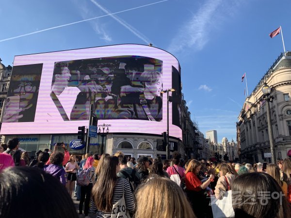5월31일 오후 6시(한국시간) 영국 런던의 중심부인 피커딜리 서커스 광장에서 방탄소년단이 모델로 나선 현대자동차 팰러세이드 광고가 1시간 동안 상영되자 전 세계 1000여명의 팬들이 이들의 음악을 들어며 노래부르고 있다.
