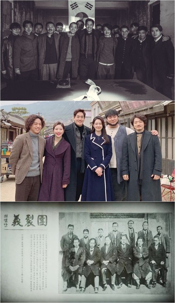이 가운데 한 커뮤니티 사이트에는 유지태(김원봉 역)-조복래(김남옥 역)를 비롯한 극중 의열단의 출정식 모습과 실제 의열단을 비교하는 사진이 등장해 화제다. 동시에 이요원(이영진 역)-유지태-조복래-박하나(차정임 역)-백승환(마자르 역)-이규호(푸줏간 주인 역)의 환한 미소가 담긴 현장 사진까지 함께 공개돼 목숨을 건 독립운동 속에서도 웃음을 잃지 않고 나아갔던 독립운동가들의 삶을 떠올리게 만들며 묵직한 전율을 선사하고 있다.