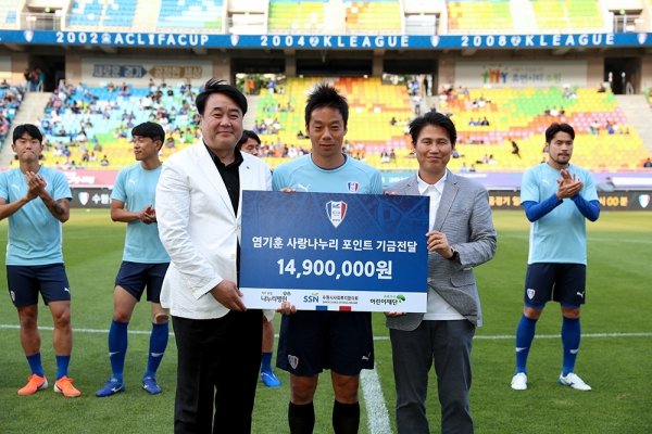 프로축구 K리그1 수원삼성 캡틴 염기훈이 지난 2일 수원월드컵경기장에서 열린 강원FC와의 경기에 앞서 초록우산 어린이재단 경기지역본부(본부장 이종화)에 사랑나누리 기금 1490만원을 전달했다.