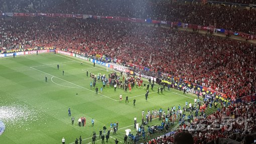 2일 마드리드의 완다 메트로폴리타노에서 열린 토트넘과의 UEFA 챔피언스리그 파이널에서 승리한 리버풀 선수들과 원정 응원단이 합동 세리머니를 하며 즐거워하고 있다. 마드리드(스페인)|남장현 기자 yoshike3@donga.com