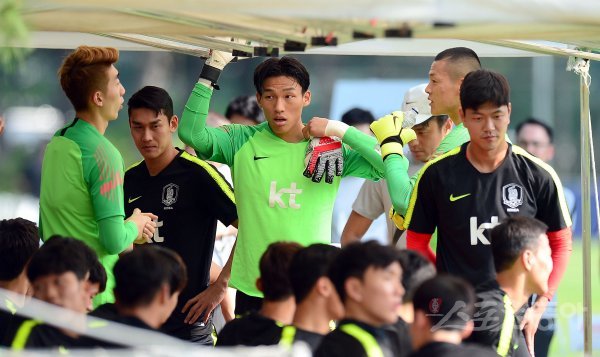 골키퍼 조현우, 김승규, 구성윤이 이야기를 나누고 있다.