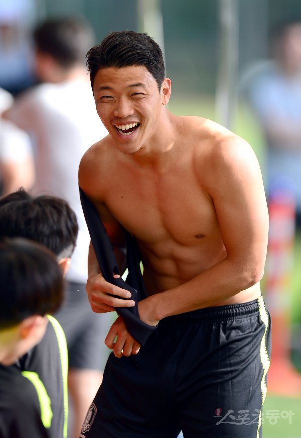 황희찬이 훈련복을 입으며 밝게 웃고 있다.