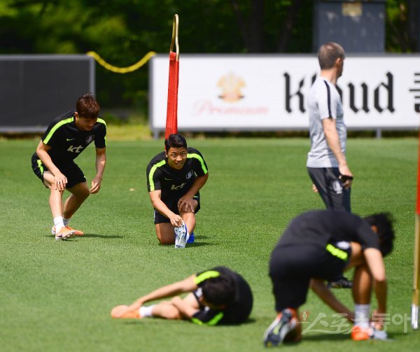 호주, 이란과 평가전을 갖는 한국 축구대표팀이 4일 파주NFC(국가대표 트레이닝센터)에 소집돼 훈련을 가졌다. 대표팀 황희찬(가운데)이 전술훈련을 마친 후 몸을 풀고 있다.