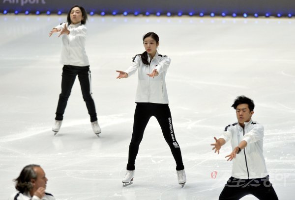 김연아가 동료들과 함께 오프닝 리허설을 준비하고 있다.