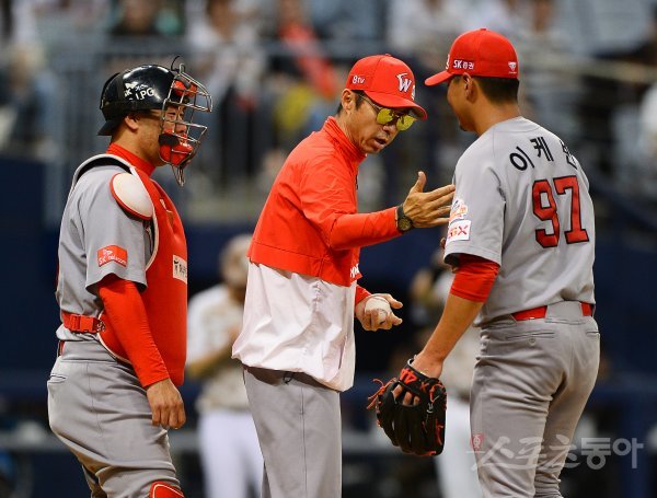 SK 선발 이케빈이 4회말 무사 만루에서 강판당하고 있다.