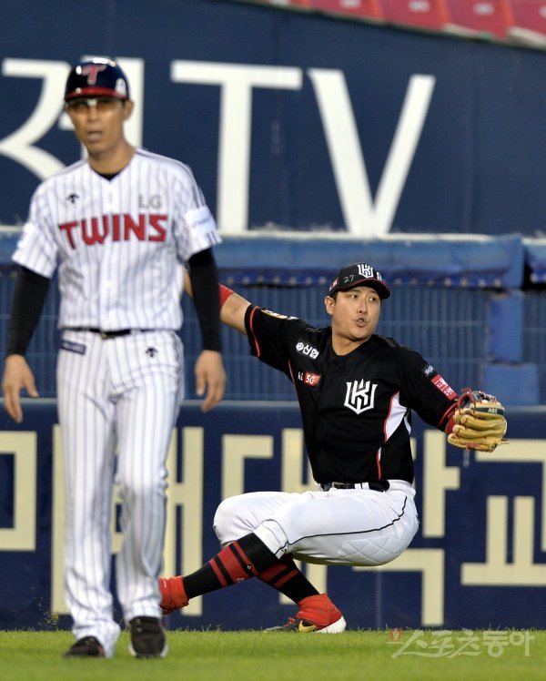 4회말 무사 만루에서 LG 이형종의 파울 타구를 kt 황재균이 넘어지며 잡아내고 있다.