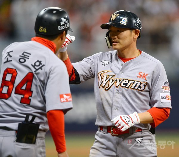 SK 김재현이 8회초 1사 만루에서 동점 적시타를 친 후 조동화 코치와 하이파이브를 하고 있다.
