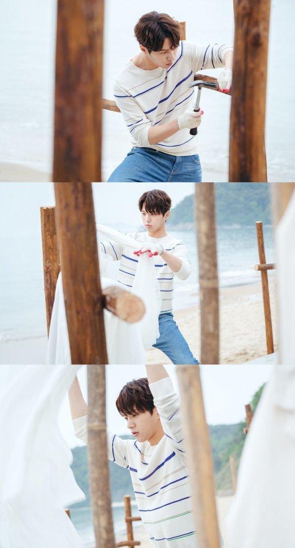 공개된 사진 속 단은 바닷가에서 열심히 무언가를 만들고 있다. 목장갑을 낀 채 나무 기둥에 뚝딱뚝딱 못질을 하고 있는가 하면, 펄럭이는 하얀 천을 보며 고민에 빠진 모습이다. 푸른 바다를 배경으로 바쁘게 움직이고 있는 단의 비주얼은 청량함을 자아내기까지 한다. 반짝반짝 빛나는 눈동자, 땀이 송골송골 맺힌 얼굴은 이연서를 생각하고 있는 단의 마음을 짐작하게 한다.